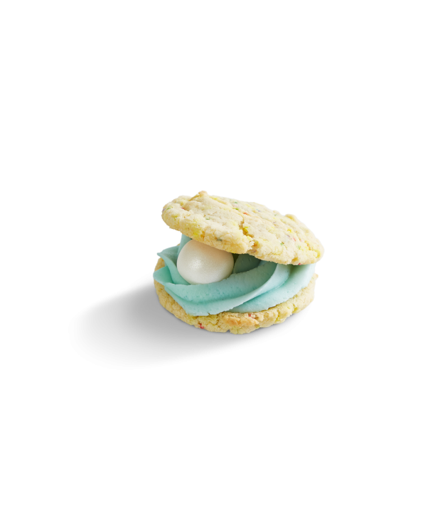 The perfect addition to any shell-ebration. Dive into a sea of pastel-perfection with this mystical creation. A sugar paste pearl swirls in waves of buttercream frosting, sandwiched between two birthday cookie oyster shells.
