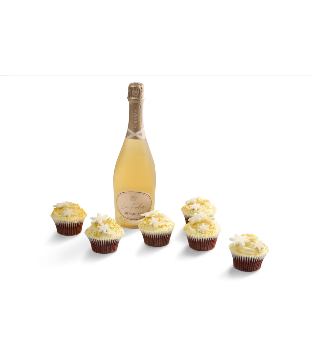This hamper includes a bottle of Mirabeau La Folie Sparkling Rosé and our Christmas Snowflake Cupcake Selection Box.