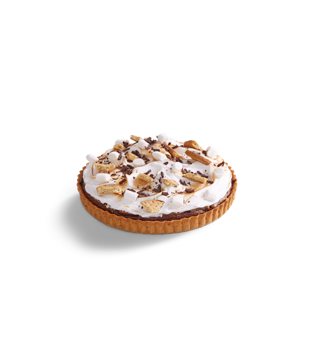 A rich, silky hot chocolate filling in a 8 inch shortcrust pastry base, topped with fluffy meringue, gooey marshmallows, chocolate curls and chunks of crunchy biscuits.