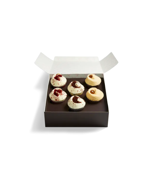 Each gift box of six cupcakes contains two Red Velvet Cupcakes, two Black Bottom Cupcakes and two Salted Caramel Cupcakes.