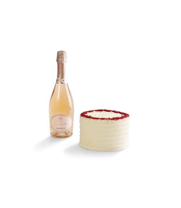 This hamper includes a bottle of Mirabeau La Folie Sparkling Rosé and our customers’ all-time favourite 6" Red Velvet Cake. Deep red vanilla cake with a light taste of chocolate, topped with cream cheese frosting. This decadent layer cake is sure to please.