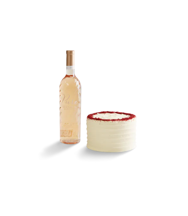 This hamper includes a bottle of Mirabeau Pure Provence Rosé and our customers’ all-time favourite 6" Red Velvet Cake. Deep red vanilla cake with a light taste of chocolate, topped with cream cheese frosting. This decadent layer cake is sure to please.