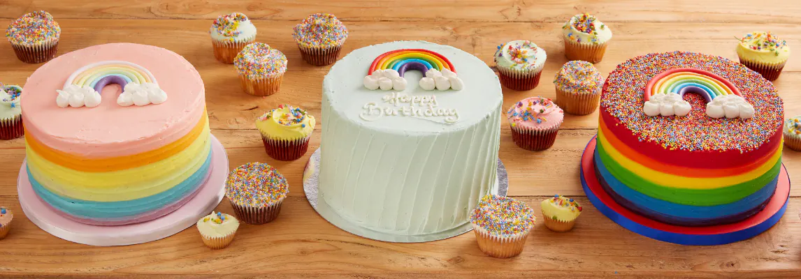 Available in different sizes, our rainbow layer cakes can serve intimate gatherings or larger parties. Want something extra special? You can even personalise your Rainbow Cake with a custom message or add themed decorations like unicorns, rainbows or birthday toppers.