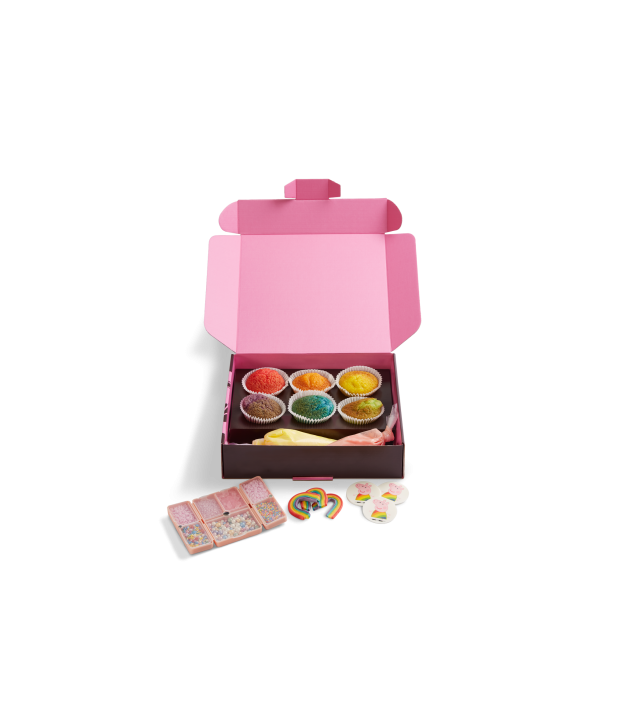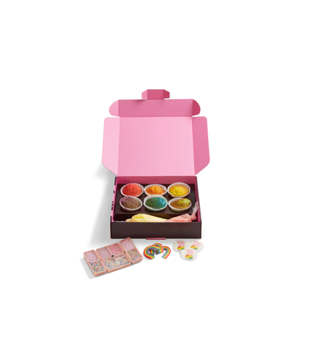 Get ready to get creative with the Rainbow Peppa Pig Decorating Kit. This Kit is just the ticket for a hands-on, rainbow and sprinkle-filled adventure. Get ready to 6 vanilla cupcake sponges in rainbow colours, pink or yellow vanilla buttercream frosting, Peppa in her Rainbow Party Dress, Rainbow decorations and a jam packed reusable sprinkle case.