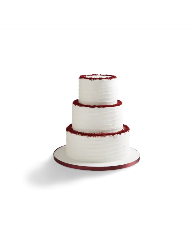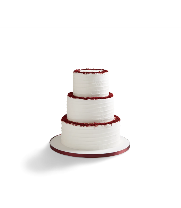 Classic Hummingbird Bakery banded-style design with Red Velvet sponge crumbs around the edge of each tier.