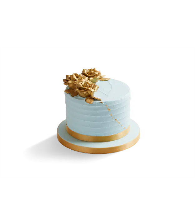 Pretty in blue and suitable for any occasion, our new Rose Collection Vanilla Cake has 4 layers of fluffy Vanilla or decadent Chocolate sponge, finished with soft blue Vanilla buttercream and topped with hand-made golden sugar paste roses and a hint of delicately trailing gold leaf.