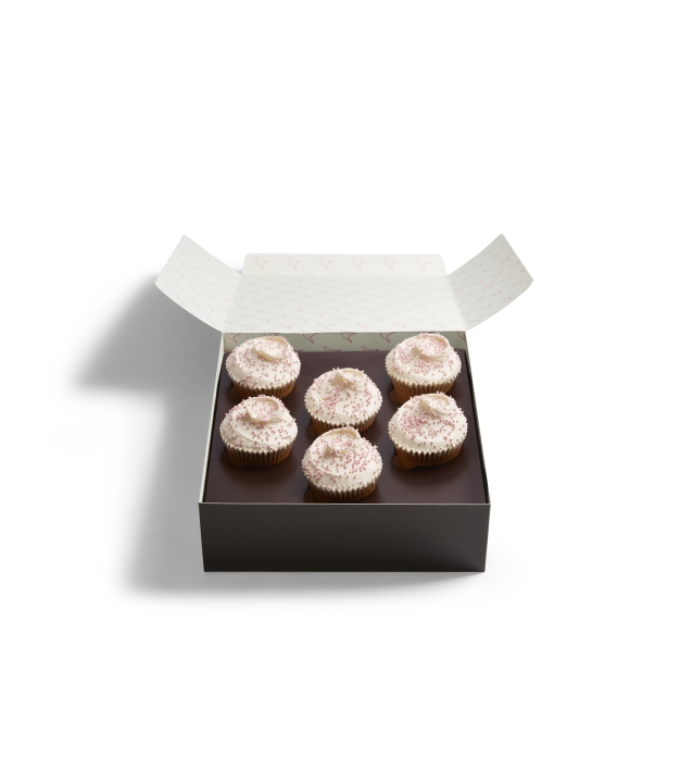 This classic cupcake box is perfect for any occasion. Containing 2 Vanilla, 2 Chocolate and 2 Red Velvet cupcakes with our signature frosting swirl and pink pearlised nonpareil sprinkles. Pair with our Rose Collection Vanilla Cake for an elegant dessert display.