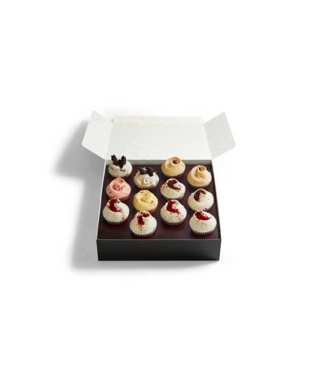Each gift box of twelve cupcakes contains four Red Velvet Cupcakes, two Cookies and Cream Cupcakes, two Salted Caramel Cupcakes, two Vanilla Cupcakes and two Black Bottom Cupcakes.