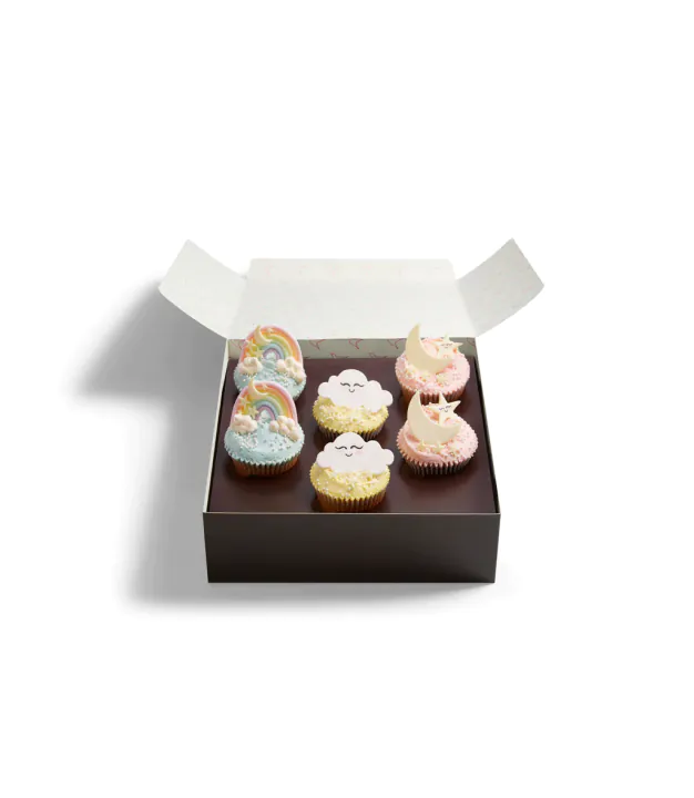 Our Story Time Collection Cupcake Selection Box contains 3 Vanilla and 3 Chocolate cupcakes. Hand-decorated with dreamy vanilla buttercream, fluffy clouds and moons and stars, this box is perfect on it's own or along with our larger Story Time Cakes. A little one’s dream!
