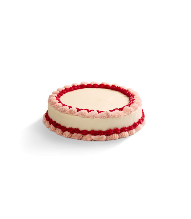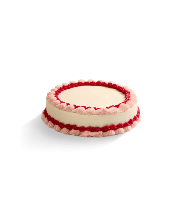Elegantly adorned in classic shell piping. This two-layer 10“ round vanilla cake has delicate swirls of soft pink and bold red vanilla buttercream trim both the top and base, creating a timeless look that feels both sweet and celebratory. Perfect for birthdays, anniversaries, or just a touch of nostalgic flair.