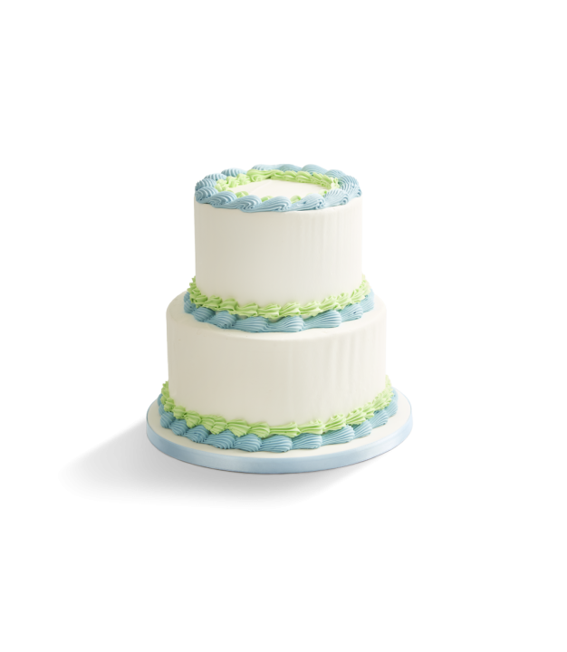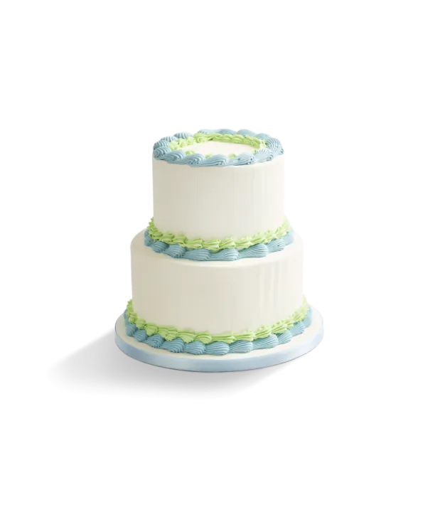 Elegantly adorned in classic shell piping. This tiered round vanilla cake has delicate swirls of light blue and pale green vanilla buttercream trim both the top and base, creating a timeless look that feels both sweet and celebratory.