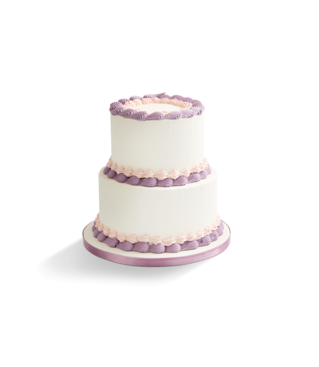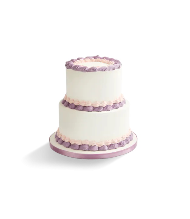 Elegantly adorned in classic shell piping. This tiered round vanilla cake has delicate swirls of light purple and pale pink vanilla buttercream trim both the top and base, creating a timeless look that feels both sweet and celebratory.