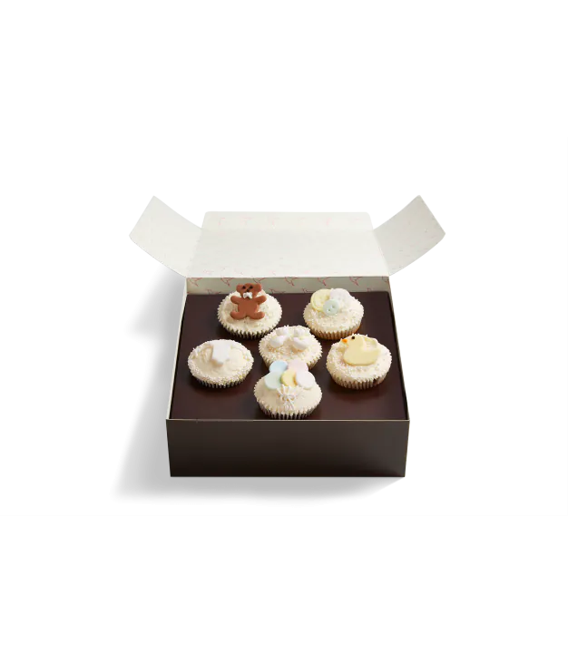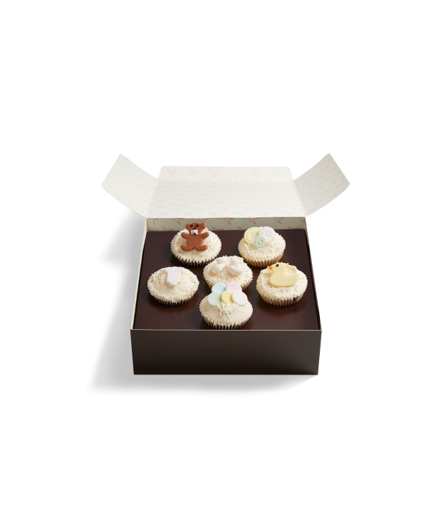 Hello little one! Welcome the new arrival with this adorable white frosted gift box of Hummingbird Bakery cupcakes topped with cute as a button baby-themed fondant designs. Make sure the stork delivers these irresistible Red Velvet, chocolate and vanilla cupcakes in time!