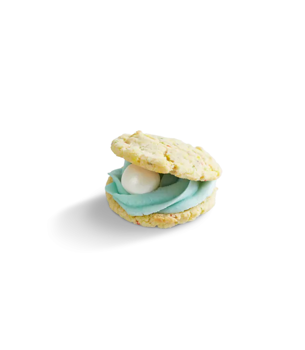 The perfect addition to any shell-ebration. Dive into a sea of pastel-perfection with this mystical creation. A sugar paste pearl swirls in waves of buttercream frosting, sandwiched between two birthday cookie oyster shells.