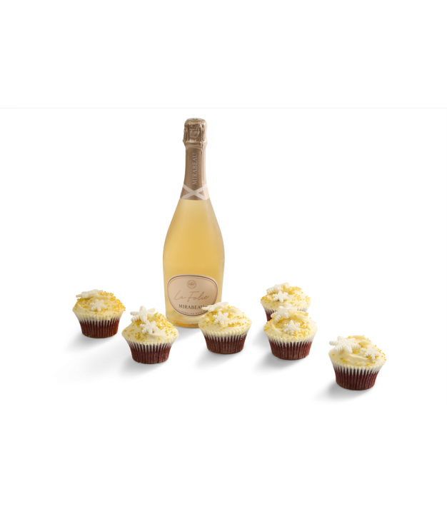 This hamper includes a bottle of Mirabeau La Folie Sparkling Rosé and our Christmas Snowflake Cupcake Selection Box.