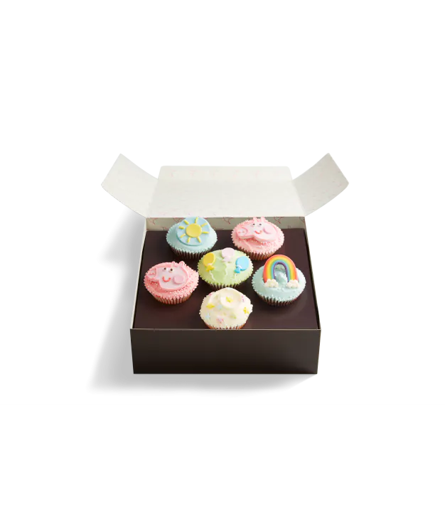 Theres nothing more cheerful than a selection of our Peppa Pig Sunny Days Cupcakes! Plunge snout first into 3 fluffy vanilla and 3 decadent chocolate cupcakes, all topped with vanilla buttercream frosting and decorated with everything a sunny day needs, rainbows, balloons and Peppa herself. Perfect for a party and as Peppa says, 'sharing is caring.'