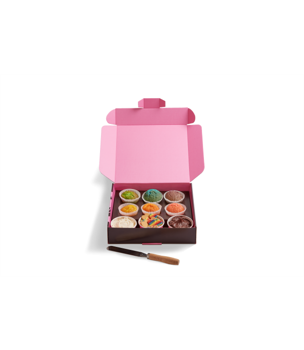 Do you want to learn how to frost your own cupcakes The Hummingbird Bakery way? This box contains 6x Vanilla Rainbow cupcake sponges, 1 x Pots of Vanilla frosting, 1x Pot of Chocolate frosting 1 x Pot of sprinkles and Rainbow decorations, 1 x Palette knife and 1 x How to guide - everything you'll need to decorate like a pro!