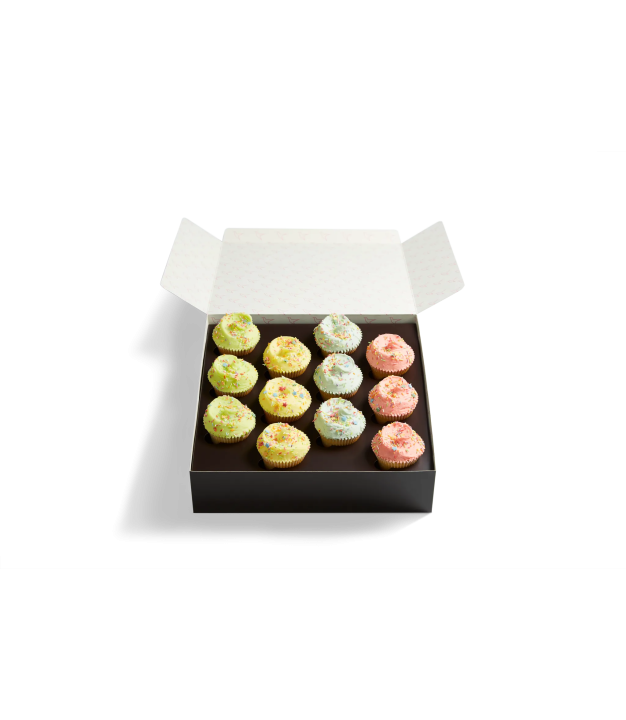 Twelve freshly baked airy Vanilla cupcakes topped with generous quantities of fluffy vanilla buttercream frosting in an array of bright colours make this the ideal cupcake selection box for sharing.